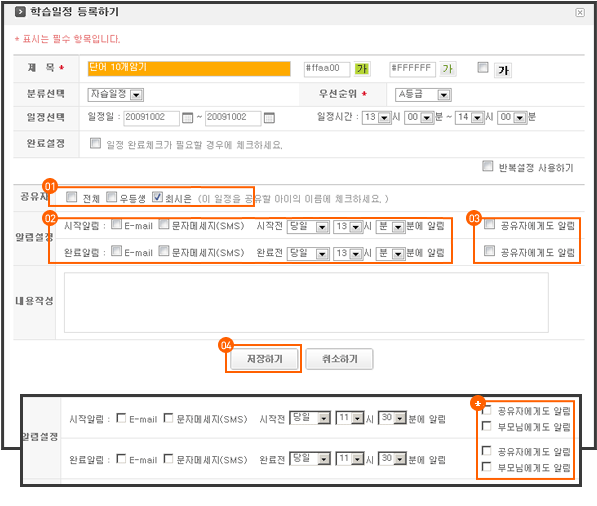 ¨è ÀÏÁ¤ÀÇ ½ÃÀÛ°ú ¿Ï·á¿©ºÎ¿¡ ´ëÇØ ¹®ÀÚ¿Í À̸ÞÀÏ·Î ¹Þ¾Æº¼ ¼ö ÀÖ½À´Ï´Ù. ¾Ë¸²¹Þ°íÀÚ ÇÏ´Â ¾Ë¸²¿É¼ÇÀ» ¼±ÅÃÇØÁÖ¼¼¿ä. ½ÃÀÛ¿Ï·á ¾Ë¸²Àº ´çÀÏ~3ÀÏÀü±îÁö ¾Ë¸²¸Þ¼¼Áö ¹ß¼Û °¡´ÉÇÕ´Ï´Ù. 10ºÐ´ÜÀ§·Î üũµÇ±â¶§¹®¿¡ 10ºÐÀÌÈÄÀÇ ÀÏÁ¤ºÎÅÍ ¾Ë¸²¸Þ¼¼Áö¸¦ ¹Þ¾Æº¼ ¼ö ÀÖ½À´Ï´Ù.